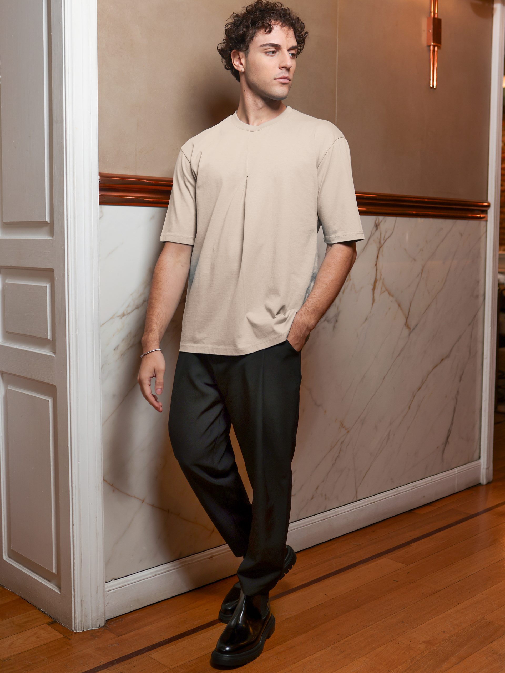 Απογείωσε το καθημερινό σου στυλ με αυτό το μοναδικό ανδρικό μπλουζάκι που ξεχωρίζει για το ιδιαίτερο σχέδιο μπροστά! Με μια κομψή πιέτα στο κέντρο, αυτό το μπλουζάκι προσθέτει μια εκλεπτυσμένη λεπτομέρεια που το κάνει να διαφέρει από τα συνηθισμένα.